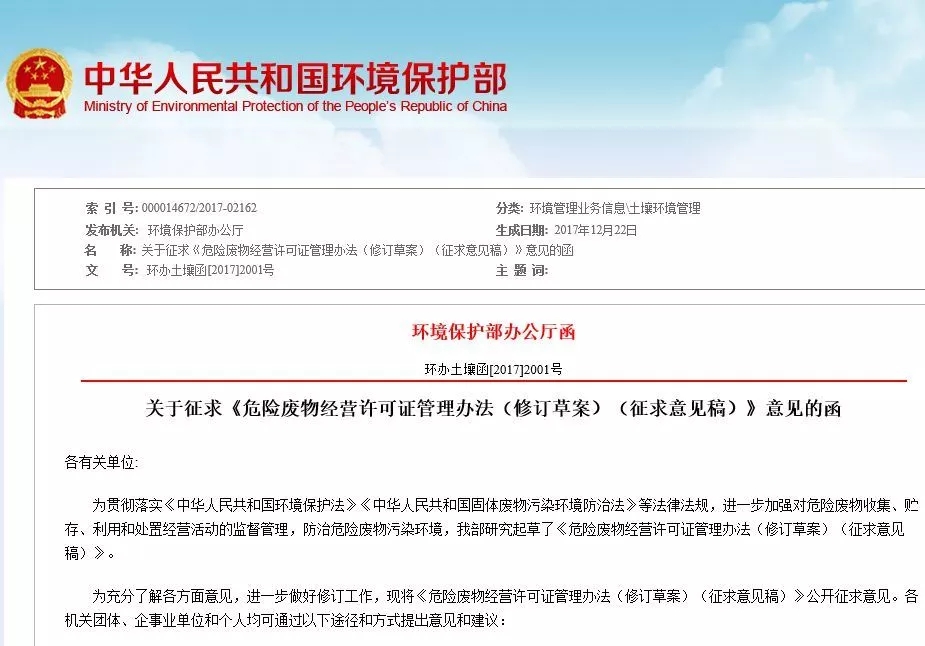 環(huán)境保護(hù)部公布的“關(guān)于征求《危險(xiǎn)廢物經(jīng)營許可證管理辦法(修訂草案)(征求意見稿)》意見的函(環(huán)辦土壤函[2017]2001號(hào)),其中,第三十九條 以下危險(xiǎn)廢物利用或者處置活動(dòng)免于領(lǐng)取危險(xiǎn)廢物經(jīng)營許可證:(一)產(chǎn)生危險(xiǎn)廢物的單位在其廠區(qū)(場所)內(nèi),自行或者委托第三方專業(yè)機(jī)構(gòu)對(duì)本單位產(chǎn)生的危險(xiǎn)廢物進(jìn)行利...