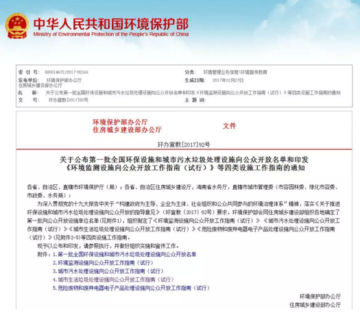近日環(huán)保部發(fā)布了關(guān)于公布第一批全國環(huán)保設(shè)施和城市污水垃圾處理設(shè)施向公眾開放名單和印發(fā)《環(huán)境監(jiān)測設(shè)施向公眾開放工作指南(試行)》等四類設(shè)施工作指南的通知。 包括29個垃圾處理設(shè)施,其中垃圾焚燒設(shè)施21個,垃圾填埋設(shè)施6個,餐廚垃圾處理設(shè)施1個,滲濾液處理設(shè)施1個,分布于全國27個省、直轄市和自治區(qū),聯(lián)...