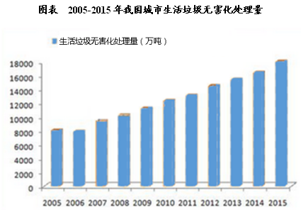 中投顧問(wèn)發(fā)布的《2017-2021年中國(guó)處理行業(yè)深度調(diào)研及投資前景預(yù)測(cè)報(bào)告》數(shù)據(jù)顯示:2015年,全國(guó)城市生活垃圾清運(yùn)量為19142.17萬(wàn)噸(約1.91億噸),處理量為18750.64萬(wàn)噸(約1.88億噸),城市生活率97.95%。截至2015年,共建設(shè)處理廠(場(chǎng))890座,其中填埋場(chǎng)640座,焚...