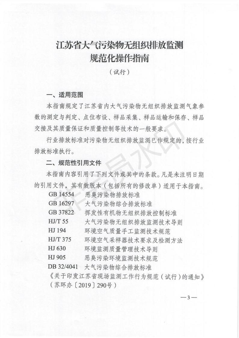 為規(guī)范指導(dǎo)江蘇省生態(tài)環(huán)境監(jiān)測機構(gòu)開展大氣污染物無組織排放監(jiān)測,強化污染溯源監(jiān)測、監(jiān)督執(zhí)法監(jiān)測的科學(xué)性、有效性和規(guī)范性,提升“科學(xué)治污、精準(zhǔn)治污”能力,更好支撐大氣污染防治工作,近日,江蘇省生態(tài)環(huán)境廳印發(fā)了《江蘇省大氣污染物無組織排放監(jiān)測規(guī)范化操作指南(試行)》。 全文如下: ...