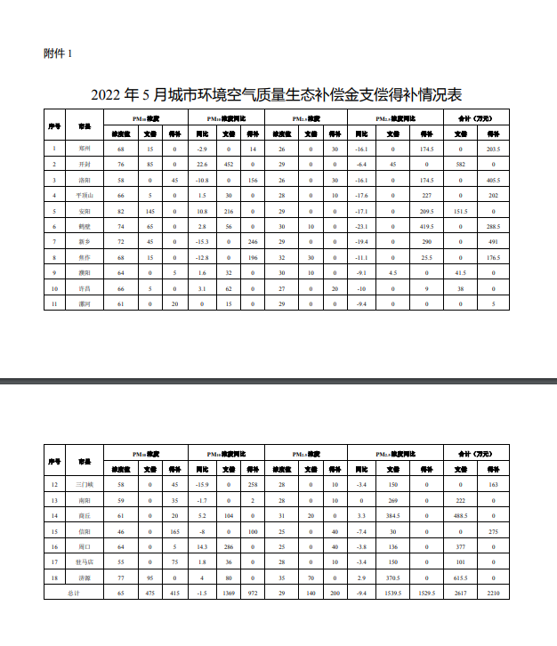根據(jù)《河南省污染防治攻堅戰(zhàn)領導小組辦公室關于印發(fā)河南省城市環(huán)境空氣質量生態(tài)補償辦法(試行)等辦法的通知》(豫環(huán)攻堅辦〔2020〕15號)要求,河南省生態(tài)環(huán)境廳廳對各省轄市的城市環(huán)境空氣質量生態(tài)補償金的支償、得補情況進行了計算。截止2022年5月,各省轄市共支償城市環(huán)境空氣質量生態(tài)補償金2617萬元,...