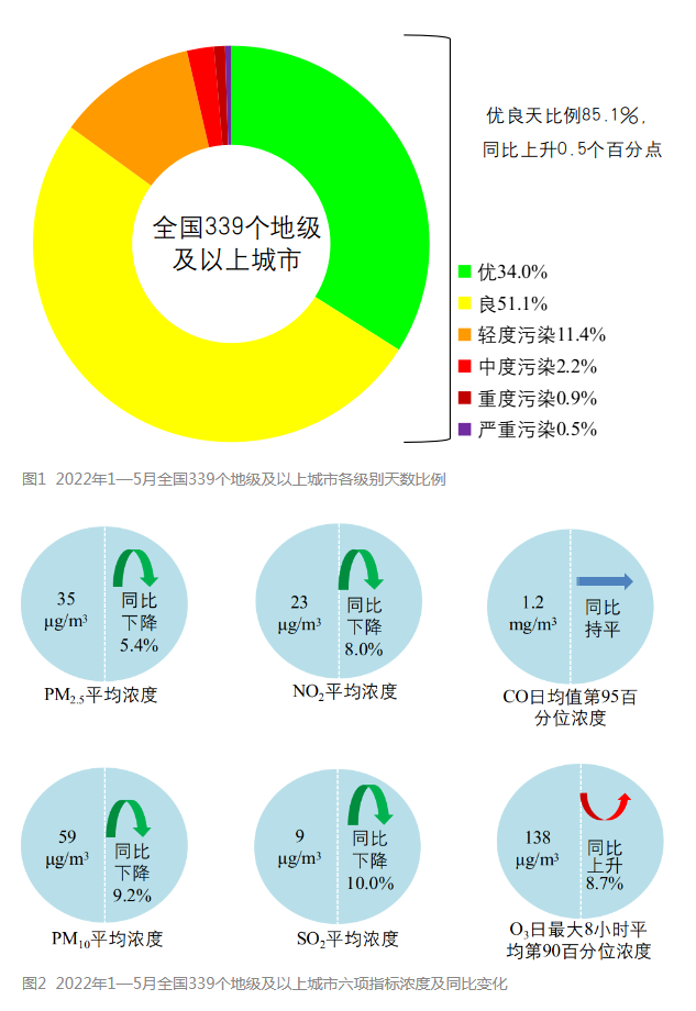 生態(tài)環(huán)境部今日向媒體通報了2022年5月和1—5月全國環(huán)境空氣質(zhì)量狀況。 環(huán)境空氣總體情況 2022年5月,全國339個地級及以上城市平均空氣質(zhì)量優(yōu)良天數(shù)比例為85.2%,同比下降2.6個百分點;PM2.5平均濃度為22微克/立方米,同比持平;PM10平均濃度為45微克/立方米,同比下降...