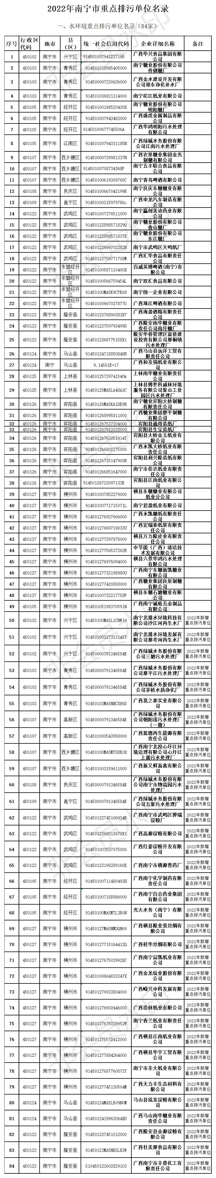 南寧市生態(tài)環(huán)境局關(guān)于印發(fā)2022年南寧市重點(diǎn)排污單位名錄的通知 各派出機(jī)構(gòu),局屬各單位,各有關(guān)單位: 為進(jìn)一步加強(qiáng)污染源環(huán)境管理及環(huán)境信息公開工作,建立健全社會(huì)監(jiān)督機(jī)制,按照《關(guān)于印發(fā)〈重點(diǎn)排污單位名錄管理規(guī)定(試行)〉的通知》(環(huán)辦監(jiān)測(cè)〔2017〕86號(hào))、《自治區(qū)生態(tài)環(huán)境廳辦公室關(guān)于進(jìn)一步做好2...