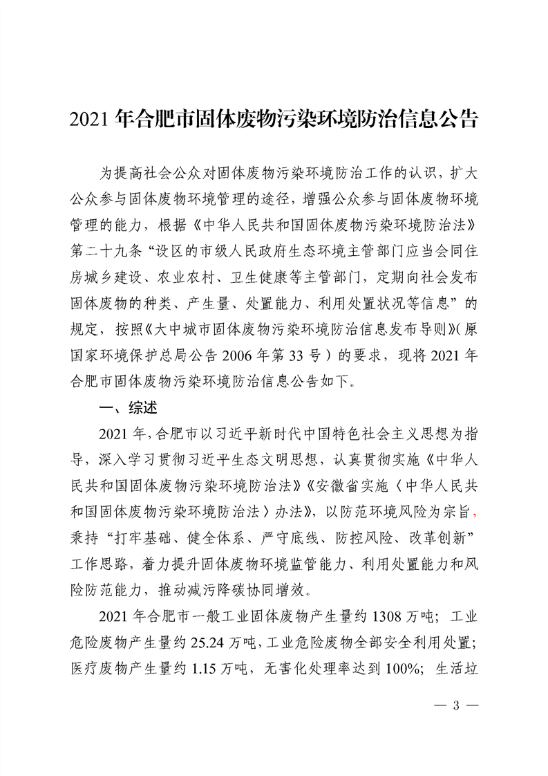 根據(jù)《大中城市固體廢物污染環(huán)境防治信息發(fā)布導(dǎo)則》(原國家環(huán)境保護(hù)總局公告2006年第33號)要求,日前,合肥市生態(tài)環(huán)境局向社會公開發(fā)布2021年合肥市固體廢物污染環(huán)境防治信息公告,提高公眾對固體廢物污染環(huán)境防治工作的認(rèn)識,擴(kuò)大公眾參與固體廢物環(huán)境管理的途徑。 強(qiáng)化危險(xiǎn)廢物管理。2021年,全市工業(yè)危...
