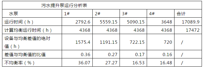 也就是說(shuō),如果在理想狀態(tài)下,污水提升泵的四臺(tái)水泵在這一年內(nèi),每臺(tái)水泵應(yīng)該運(yùn)行4368小時(shí),我們根據(jù)這個(gè)計(jì)算的均衡運(yùn)行時(shí)間來(lái)和實(shí)際的運(yùn)行時(shí)間進(jìn)行差值對(duì)比,為了計(jì)算方便,我們把差值進(jìn)行了絕對(duì)值的運(yùn)算,正負(fù)都取正,方便后面的運(yùn)算,計(jì)算出差值后,和計(jì)算的均衡值進(jìn)行對(duì)比,我們可以得出一個(gè)比值,然后進(jìn)行百分比的運(yùn)算后,得出不均衡率的數(shù)值,大家注意下,這里的百分比計(jì)算出來(lái)的總和不是100,這是因?yàn)槲覀冇?jì)算的基礎(chǔ)不是以實(shí)際運(yùn)行的時(shí)間為基礎(chǔ)計(jì)算的,而是以計(jì)算的均衡時(shí)間為基礎(chǔ)計(jì)算的,因此總和不是100%,而是96.35%,和實(shí)際運(yùn)行時(shí)間與計(jì)算均衡運(yùn)行時(shí)間的比值相同,注意小數(shù)點(diǎn)的省略位數(shù)不同,結(jié)果會(huì)稍有差別。