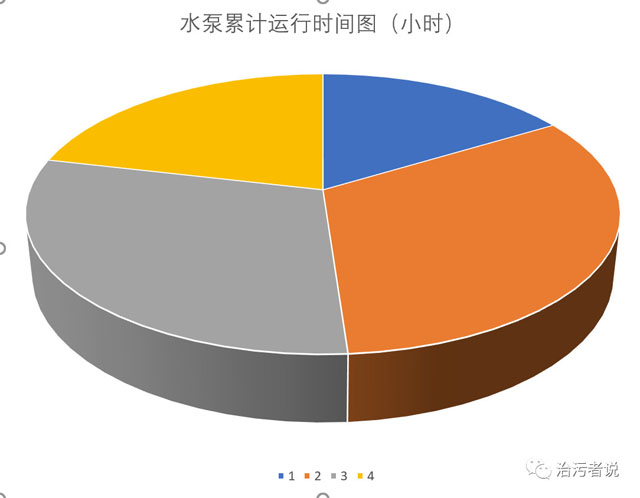 這是某污水廠某個(gè)運(yùn)行年度的設(shè)備運(yùn)行狀況的統(tǒng)計(jì)表,通過(guò)運(yùn)行時(shí)間的統(tǒng)計(jì)我們可以得到污水廠設(shè)備的運(yùn)行情況,特別是在設(shè)備統(tǒng)計(jì)上引入不均衡率的統(tǒng)計(jì),這個(gè)統(tǒng)計(jì)分析,是希望得到設(shè)備的均衡運(yùn)行的對(duì)比,這個(gè)分析是通過(guò)同一區(qū)域同一功能的設(shè)備,在全年穩(wěn)定運(yùn)行的365天,24小時(shí)運(yùn)行的所必須的臺(tái)數(shù)為總時(shí)間,均勻分布到每一臺(tái)設(shè)備上,得出設(shè)備均衡運(yùn)行的時(shí)間數(shù)值,然后用實(shí)際運(yùn)行時(shí)間和計(jì)算的均衡時(shí)間數(shù)進(jìn)行比較得出數(shù)值,這個(gè)數(shù)據(jù)可以很明顯的反應(yīng)出同一區(qū)域的相同設(shè)備的不同的運(yùn)行占比,通過(guò)餅圖我們更能明顯的看出各個(gè)設(shè)備之間的占比情況,我們把4臺(tái)污水提升泵的運(yùn)行的時(shí)間和不均衡率分析表格如下: