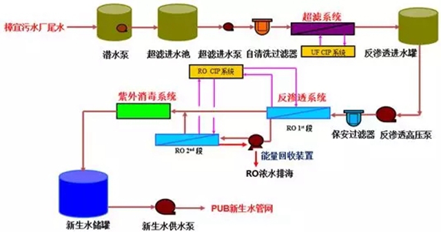 本項目采用了超濾、反滲透、UV殺菌三段工藝(工藝流程如圖2所示)。原水是樟宜污水廠二級生化處理出水,其主要污染物為懸浮顆粒物、有機(jī)污染物、溶解性無機(jī)物、細(xì)菌、病毒等。超濾工藝段主要目的是降低水的濁度,去除水中的懸浮顆粒物、大分子有機(jī)物和細(xì)菌等。反滲透工藝段采用過濾孔徑小于1納米的反滲透膜,去除各種小分子無機(jī)鹽、有機(jī)物和病毒。UV殺菌段進(jìn)一步殺滅水中殘留的致病菌和病毒,最終成品水進(jìn)入新生水儲罐,由新加坡公用事業(yè)局進(jìn)行統(tǒng)一調(diào)配。反滲透系統(tǒng)采用一級二段式,一段反滲透的濃水再經(jīng)過二段反滲透,進(jìn)一步回收淡水,在一段反滲透和二段反滲透之間增加能量回收裝置,達(dá)到節(jié)能目的。
