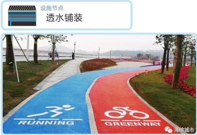 項(xiàng)目利用紅藍(lán)兩條濱水自行車道和綠道作為串聯(lián),將整個(gè)項(xiàng)目各分散部分完整地連接起來。整條透水海綿路面,利用經(jīng)特殊工藝處理的納米材料對(duì)膠凝材料進(jìn)行改性,改善了無機(jī)聚合物材料的物相組成和微觀結(jié)構(gòu),使之具有高吸水率、高透水率、高強(qiáng)度、抗?jié)B、抗凍、抗沖、耐磨、耐化學(xué)腐蝕等顯著優(yōu)點(diǎn),能對(duì)雨水進(jìn)行初步凈化。同時(shí),路面保護(hù)層采用水性環(huán)保耐磨材料,同時(shí)添加納米光觸媒材料,在提高耐磨性的同時(shí),可有效降解汽車尾氣,改善空氣質(zhì)量。