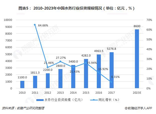 數(shù)據(jù)顯示,“十二五”期間水務(wù)行業(yè)的投資力度以年均24%的速度增長(zhǎng)。2016年,中國(guó)水務(wù)行業(yè)的年度投資額達(dá)到4963.52億元。2017年水務(wù)行業(yè)投資額為5276.78億元。預(yù)計(jì),到2023年,我國(guó)水務(wù)行業(yè)的年度投資額將突破8600億元。