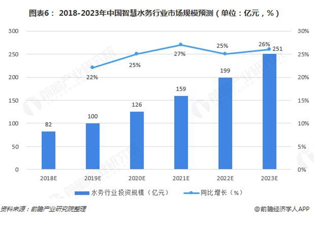 隨著水務(wù)投資規(guī)模的增加,智慧水務(wù)將迎來(lái)發(fā)展的黃金期。預(yù)計(jì)到2023年,中國(guó)智慧水務(wù)行業(yè)規(guī)模將達(dá)到251億元左右。