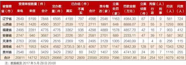 4月28日至5月28日,第三批7個(gè)中央環(huán)境保護(hù)督察組共計(jì)受理舉報(bào)35523個(gè),經(jīng)梳理分析并合并重復(fù)舉報(bào),累計(jì)向被督察地方交辦有效舉報(bào)28966件。地方已辦結(jié)23599件,責(zé)令整改20359家,立案處罰7086家,共計(jì)罰款33587.86萬元;立案偵查354件,行政和刑事拘留355人,約談6079人,問責(zé)4018人。