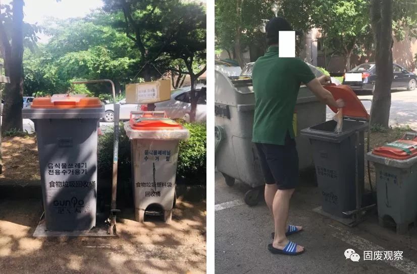 下圖中,左邊的大桶為“食物垃圾回收桶”,右邊的小桶為食物垃圾塑料袋收集桶,兩個(gè)桶都帶有腳閥,居民可以用腳閥打開桶蓋,避免弄臟雙手。食物垃圾桶旁邊通常設(shè)有洗手池及肥皂,丟棄垃圾時(shí)弄臟雙手可以清洗?;厥召M(fèi)用由整個(gè)小區(qū)的人一起平攤,收費(fèi)包含在每個(gè)月的物業(yè)管理費(fèi)中。以軍浦市某小區(qū)為例,2018年1-7月,每家每月的食物垃圾處理費(fèi)約為人民幣4-6元。