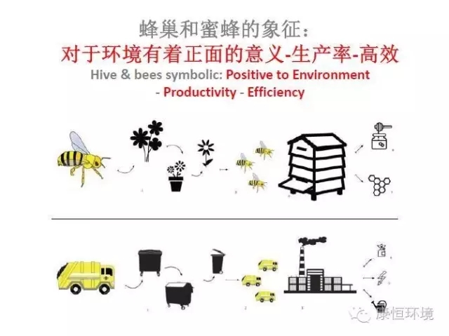 蜂巢狀玻璃幕墻的設(shè)計(jì)靈感來(lái)源于蜜蜂把花粉釀蜜的過程。設(shè)計(jì)師把每天奔波在城市中的眾多垃圾回收車輛比喻蜜蜂收集花粉的過程,把生活垃圾焚燒發(fā)電廠比喻蜂巢,將收集的生活垃圾在焚燒發(fā)電廠變成清潔能源的過程比喻蜜蜂釀蜜,非常形象的展現(xiàn)了康恒寧波鄞州垃圾焚燒發(fā)電廠的建造理念。