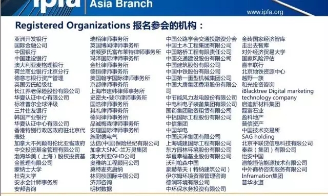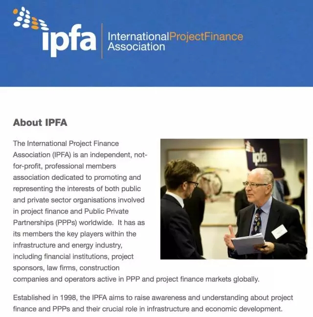 國際項(xiàng)目融資協(xié)會(IPFA)是于 1998 年 11 月在倫敦成立的非盈利性國際機(jī)構(gòu),在全球有超過600家的機(jī)構(gòu)會員,是全球最大的聚焦項(xiàng)目融資和PPP的專業(yè)網(wǎng)絡(luò)和交流平臺。其會員多是基礎(chǔ)設(shè)施建設(shè)和能源行業(yè)的主要參與者,包括金融機(jī)構(gòu)、項(xiàng)目發(fā)起人、律師事務(wù)所、建筑公司以及從事PPP項(xiàng)目的運(yùn)營商。