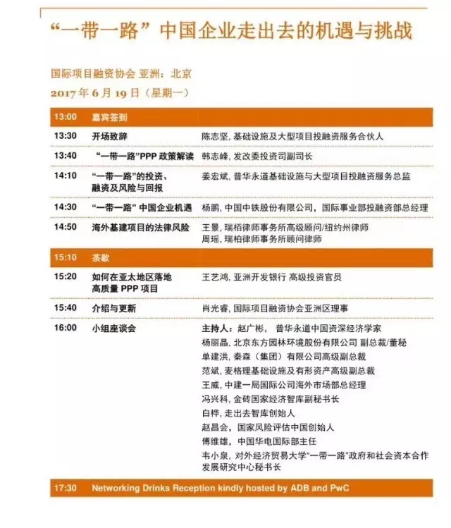 由IPFA的兩個(gè)會員機(jī)構(gòu)亞洲開發(fā)銀行和普華永道PwC聯(lián)合舉辦,邀請來自國家發(fā)展改革委、國際金融機(jī)構(gòu)、咨詢公司、律師事務(wù)所、智庫和中國企業(yè)等嘉賓,共同討論快速發(fā)展的國內(nèi)PPP市場和激增的走出去需求所帶來的機(jī)遇和挑戰(zhàn),并向中國公司提供政策解讀和專業(yè)建議。參加活動的發(fā)言嘉賓,個(gè)個(gè)堪稱重量級,如發(fā)改委投資司副司長韓志鋒,亞行高級投資官員王藝鴻,普華永道基礎(chǔ)設(shè)施與大型項(xiàng)目投融資服務(wù)總監(jiān)姜宏斌,中國中鐵股份公司國際事業(yè)部投融資部總經(jīng)理?xiàng)铢i等等。