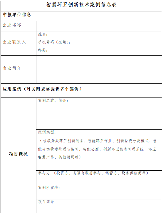 智慧環(huán)衛(wèi)是智慧城市的一個(gè)重要組成部分,智慧城市的建設(shè)迫切需要智慧環(huán)衛(wèi)的提升。在此背景下,中國環(huán)聯(lián)擬面向行業(yè)征集“智慧環(huán)衛(wèi)創(chuàng)新技術(shù)案例”,征集范圍包括垃圾分類環(huán)衛(wèi)創(chuàng)新裝備、智能環(huán)衛(wèi)作業(yè)、創(chuàng)新垃圾分類模式、智能分類收運(yùn)處理與監(jiān)管、智能公廁、創(chuàng)新環(huán)衛(wèi)信息管理系統(tǒng)、環(huán)衛(wèi)智慧產(chǎn)品等的環(huán)衛(wèi)相關(guān)落地應(yīng)用項(xiàng)目案例。請有意向的企業(yè)按附件填寫申報(bào)表,并發(fā)郵件至以下郵箱地址。