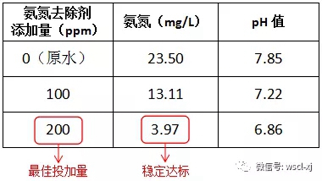 最終經(jīng)過現(xiàn)場調(diào)試,氨氮去除劑確定在200ppm(每噸廢水加0.2kg)就可以將氨氮控制在5ppm以下。