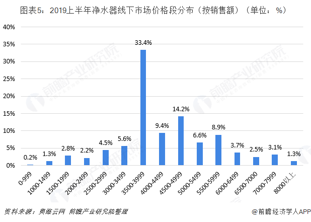 2019年上半年,在線下市場中,凈水器價格基本呈正態(tài)分布。3500-3999價格段市場占有率最高,達(dá)到33.4%;其次是4500-4999段,占比達(dá)到14.2%。