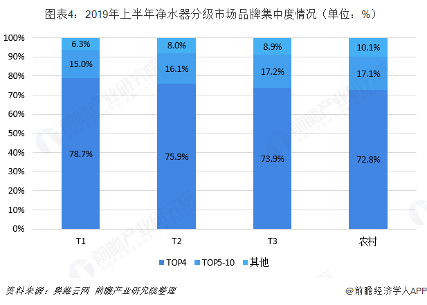 2019年上半年,一級市場TOP4品牌集中率為78.7%,這一比例在農(nóng)村市場縮減至72.8%。