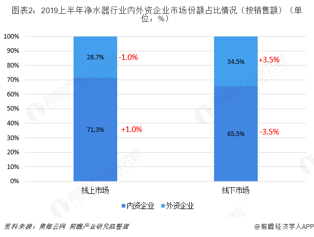 2019年上半年中國凈水器線下市場與2018年上半年相比新進(jìn)入行業(yè)品牌20個,退出行業(yè)品牌20個,凈水器線下市場整體品牌數(shù)量保持不變,共計105個。從銷售額的角度來看,內(nèi)資企業(yè)占據(jù)大部分市場份額,占比達(dá)到65.5%,同比下降3.5個百分點;外資企業(yè)占比達(dá)到34.5%,同比增長3.5個百分點。
