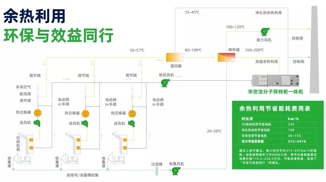 華世潔分子篩轉(zhuǎn)輪一體機采用先進的“沸石轉(zhuǎn)輪吸附濃縮+催化氧化燃燒+余熱利用”的工藝。低溫條件下,大風量的VOCs廢氣通過分子篩轉(zhuǎn)輪吸附后達標排放。吸附有大量VOCs的轉(zhuǎn)輪旋轉(zhuǎn)進入高溫脫附區(qū),形成小風量的高濃度廢氣,送入后端的CO催化氧化系統(tǒng)進行處理。CO凈化后的廢氣高溫的熱風可通過換熱等方式進行余熱利用。即開即用,減少無組織濃度揮發(fā),徹底降低溶劑殘留。