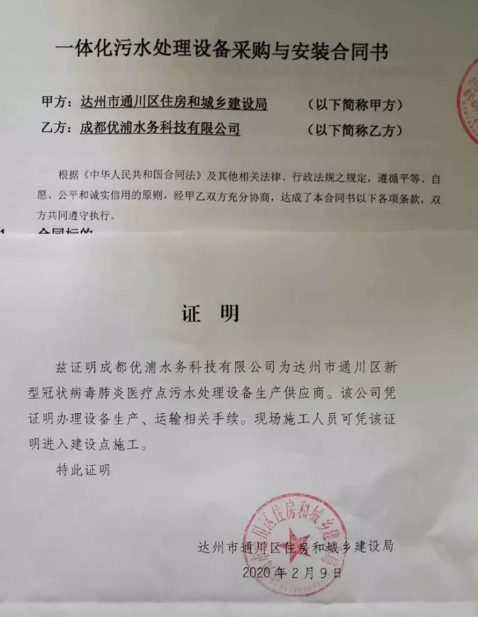 2月9日,因疫情防控需要,達州市通川區(qū)住房和城鄉(xiāng)建設局緊急指定優(yōu)普為達州市通川區(qū)新型冠狀病毒肺炎醫(yī)療點污水處理設備生產(chǎn)供應商,目前已經(jīng)妥當組織好設備生產(chǎn)和安裝、調(diào)試計劃。