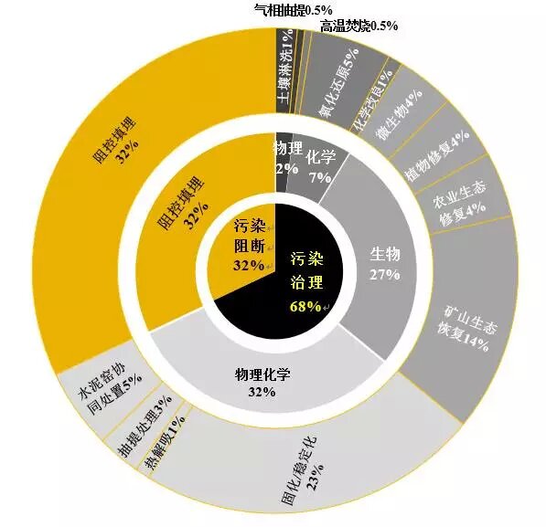 根據(jù)江蘇?。ㄒ伺d)環(huán)保產(chǎn)業(yè)技術(shù)研究院及土盟對公開招投標(biāo)項目的統(tǒng)計調(diào)查發(fā)現(xiàn),2008-2016年,我國177個土壤修復(fù)項目中,土壤修復(fù)以污染介質(zhì)治理技術(shù)為主,占比68%;污染途徑阻斷技術(shù)占比32%。在污染介質(zhì)治理技術(shù)中,物理化學(xué)和生物技術(shù)成為主要技術(shù),分別占比32%和27%;物理、化學(xué)單一類技術(shù)應(yīng)用占比相對較小,分別為2%和7%(圖 1)。