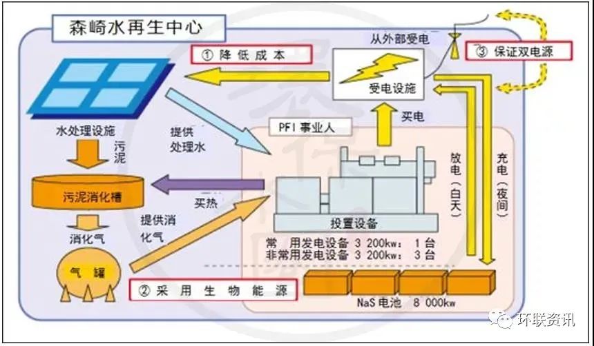 森崎水回收中心東部還設(shè)有有四個(gè)消化罐,用來(lái)從有機(jī)污泥成分中產(chǎn)生甲烷氣體,這將減少最終的污泥體積。每個(gè)消化罐內(nèi)徑28米,深度19.5米(容積12000立方米),消化溫度約為50攝氏度。為了構(gòu)建可持續(xù)發(fā)展和循環(huán)型社會(huì),為下一代營(yíng)造宜人的全球環(huán)境,森崎水回收中心正在努力利用污水處理過(guò)程中產(chǎn)生的能量,污泥和再生水來(lái)獲得資源和能源。夏季的廢水溫度低于夏季,冬季的溫度高于大氣溫度,“城市供熱”系統(tǒng)正是利用廢水溫差來(lái)實(shí)現(xiàn)區(qū)域供熱和制冷的。“城市供熱”系統(tǒng)的采用減少了化石燃料(石油,天然氣等)的使用,并有助于減少空氣污染物和電力消耗。項(xiàng)目開(kāi)始時(shí)間:2006年10月將從水再生中心獲得的處理后的廢水供應(yīng)到新的索尼公司大樓,以冷卻大樓的空調(diào)設(shè)備??照{(diào)產(chǎn)生的廢熱,通過(guò)熱交換器處理后被廢水吸收。該項(xiàng)目的環(huán)境影響是,由于冷卻設(shè)備運(yùn)行所需的電力和自來(lái)水的減少,CO2排放量每年減少約22 t。此外,與將所有熱量釋放到大氣中的常規(guī)方法相比,該項(xiàng)目中的熱量釋放到處理后的廢水中,有助于應(yīng)對(duì)熱島現(xiàn)象。 生物質(zhì)發(fā)電(與私營(yíng)企業(yè)合作)廢水處理方法中產(chǎn)生的污泥在消化池中加熱,然后污泥中的有機(jī)物變成甲烷氣,減少了污泥量。過(guò)程中產(chǎn)生的甲烷是生物質(zhì)(可再生)能源,可以被用作發(fā)電設(shè)備的燃料,每年可發(fā)電22.8 kWh。在發(fā)電設(shè)施的安裝和管理方面,森崎率先引進(jìn)了PFI(私人融資計(jì)劃:是一種公私合作的方法,將資金、技術(shù)知識(shí)和管理技能從私營(yíng)部門(mén)帶到公共機(jī)構(gòu)),它可以降低設(shè)施建設(shè)或維護(hù)/管理的成本。它也通過(guò)可交易的綠色證書(shū)作為環(huán)境價(jià)值能源轉(zhuǎn)讓給第三方。該中心還安裝了世界上最大的NaS電池設(shè)備,用于全天的分布式電力負(fù)載:在夜間有效地使用低成本的電力,并在用電高峰期減少使用電池供電。