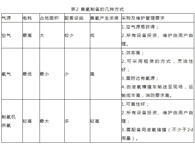 臭氧的制備主要采用電暈放電法,氣源主要有空氣、氧氣及制氧機供氧幾種,大型臭氧制備基本采用氧氣法,幾種制備方法比較如表2所示: