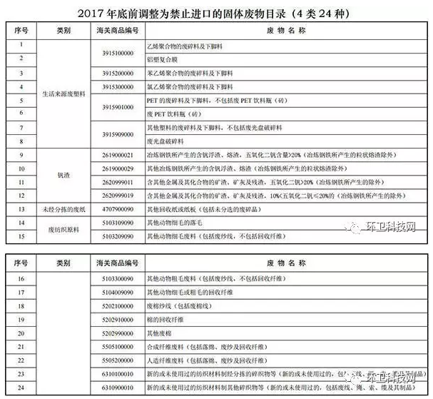 7月18日,環(huán)保部向WTO提交了一份文件,該文件稱,自2017年底開始,中國將禁止4類24種固體廢料的進口,包括生活源廢塑料、釩渣、未分類的廢紙及廢紡織品等等。該通知的擬通過日期待定,擬生效日期則為2017年9月。