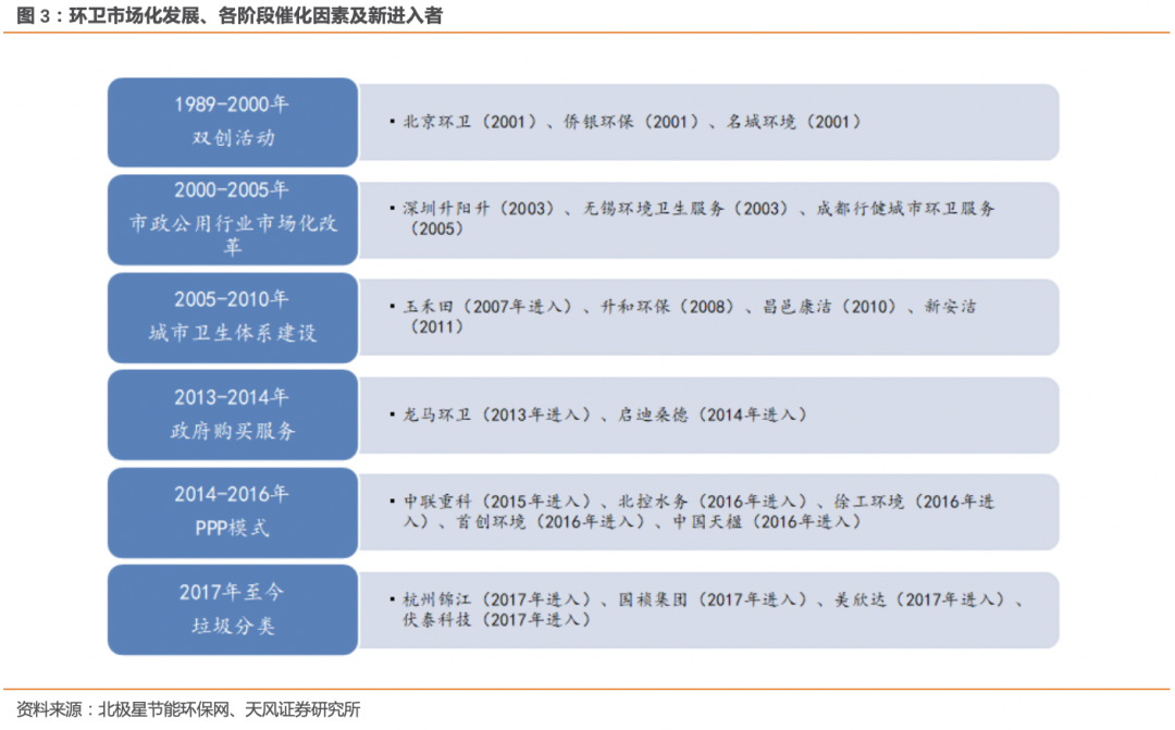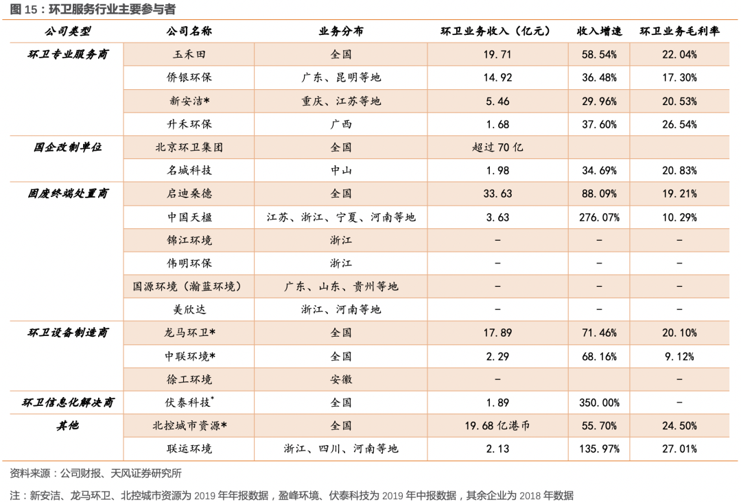▍環(huán)衛(wèi)行業(yè)市場化本輪加速的原因是什么?垃圾分類強制推動經(jīng)過2015年至今的快速推廣,全國環(huán)衛(wèi)行業(yè)新增年化訂單已達550億,總合同額達到2223億元,連續(xù)兩年環(huán)衛(wèi)市場化新增合同總金額突破2000億元,市場化快速推廣。2018-2019年環(huán)衛(wèi)市場化快速推進背后的主要原因,是垃圾分類強制實施的政策催化。▍環(huán)衛(wèi)服務行業(yè)的市場空間有多大?從傳統(tǒng)環(huán)衛(wèi)向城市物業(yè)管理擴容傳統(tǒng)環(huán)衛(wèi)服務市場包括道路清掃、垃圾清運、公廁維護等,預計每年運營市場空間在1500億,隨設(shè)施增加和單價上漲,預計2020年可達2300億。垃圾分類市場是潛在市場空間接近千億的新興市場,而城市服務管理是更大的潛在市場,隨著城市管理體制從分散走向綜合,環(huán)衛(wèi)一體化項目增多,綠化養(yǎng)護、照明維護等更多內(nèi)容被打包進來,環(huán)衛(wèi)企業(yè)面臨的市場空間逐步擴容。▍環(huán)衛(wèi)裝備行業(yè)的市場空間有多大?存量需求崛起根據(jù)住建部的統(tǒng)計年鑒,2018年我國城市和縣城合計的道路清掃保潔機械化率約67.68%,達到基本環(huán)衛(wèi)裝備階段?;跈C械化率提升產(chǎn)生的新增設(shè)備需求,和環(huán)衛(wèi)裝備折舊產(chǎn)生的存量替代需求,我們預測環(huán)衛(wèi)裝備存量更新需求將崛起,到2025年市場空間可達1025億/年,市場逐步釋放。▍環(huán)衛(wèi)服務的競爭格局如何?市場分散,行業(yè)集中度提升趨勢明顯環(huán)衛(wèi)服務行業(yè)參與者眾多,top5市場份額僅11.4%。目前行業(yè)內(nèi)參與者可大致分為環(huán)衛(wèi)專業(yè)服務商、國企改制單位、固廢終端處置商、環(huán)衛(wèi)設(shè)備制造商和環(huán)衛(wèi)信息化解決商等。2019年下半年以來PPP模式預期升溫,二次市場化的環(huán)衛(wèi)項目具有一定的規(guī)模化趨勢,從而提高行業(yè)進入門檻,預計環(huán)衛(wèi)服務行業(yè)的集中度將獲得明顯提升。▍環(huán)衛(wèi)裝備業(yè)的發(fā)展趨勢和競爭格局將如何?客戶和產(chǎn)品結(jié)構(gòu)升級,競爭格局穩(wěn)定隨著環(huán)衛(wèi)市場化推進,裝備業(yè)的市場化客戶占比提升,裝備產(chǎn)品向新能源、智能化方向發(fā)展,TOP3市場份額約40%,行業(yè)格局將維持穩(wěn)定。我們認為環(huán)衛(wèi)服務龍頭企業(yè)將同時受益于行業(yè)空間擴容、和市場集中度提升,建議關(guān)注【玉禾田】【僑銀環(huán)?!俊君堮R環(huán)衛(wèi)】【啟迪桑德】【北控城市資源】【盈峰環(huán)境】【中國天楹】。環(huán)衛(wèi)裝備存量需求崛起,預計行業(yè)格局維持穩(wěn)定,建議關(guān)注【盈峰環(huán)境】【龍馬環(huán)衛(wèi)】。▍風險提示:行業(yè)競爭加劇、環(huán)衛(wèi)市場化推進慢于預期、存量裝備更新替代慢于預期1. 環(huán)衛(wèi)行業(yè)市場化本輪加速的原因是什么?垃圾分類強制推動1.1. 環(huán)衛(wèi)行業(yè)目前處于市場化快速推廣發(fā)展階段我國環(huán)衛(wèi)服務產(chǎn)業(yè)從建國以來經(jīng)歷了三個發(fā)展階段:- 政府行政職能主導管理階段:市政環(huán)衛(wèi)工作在政府主導下,由事業(yè)單位環(huán)衛(wèi)部門進行監(jiān)管、實施。直到本世紀初,事業(yè)單位仍然是絕對主體,偶爾會有一些邊緣業(yè)務交給個體性質(zhì)的組織來承擔,業(yè)務規(guī)模小。