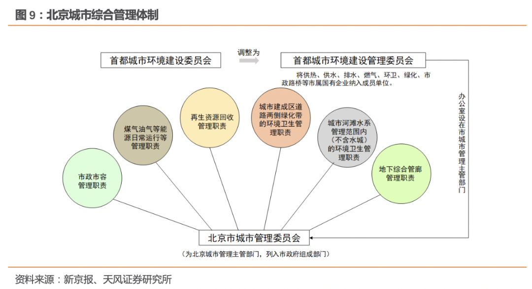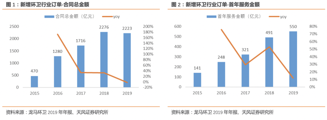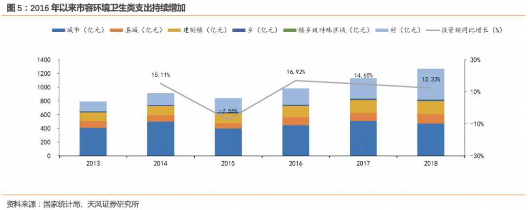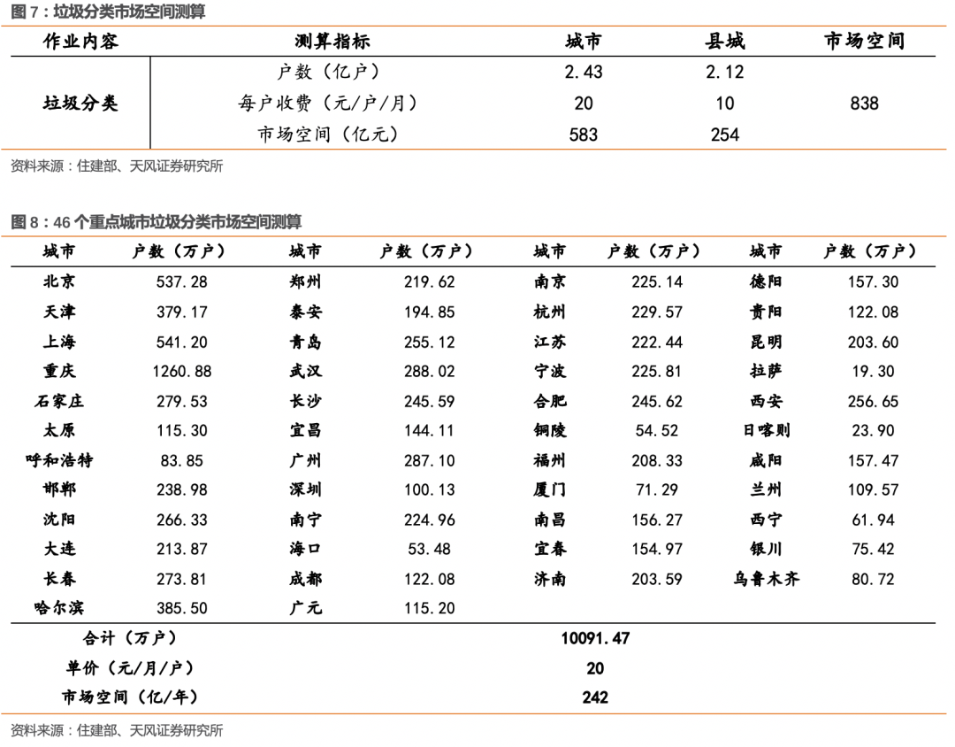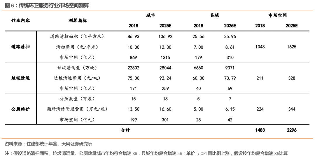 1.2. 環(huán)衛(wèi)市場化新增訂單連續(xù)兩年突破2000億元經(jīng)過2015年至今的快速推廣,全國環(huán)衛(wèi)行業(yè)新增年化訂單已經(jīng)達到550億,同比增長12%;總合同額達到2223億元,同比略降2%;平均合同期限4年,同比下降0.6年。2018-2019年連續(xù)兩年環(huán)衛(wèi)市場化新增合同總金額突破2000億元,市場化快速推廣。1.3. 本輪環(huán)衛(wèi)市場化快速推進的背后,是垃圾分類強制推動2018-2019年環(huán)衛(wèi)市場化快速推進背后的主要原因,是垃圾分類強制實施的政策催化。2016年底,習近平總書記在中央財經(jīng)領(lǐng)導小組第十四次會議上強調(diào)普遍推行垃圾分類制度,2017年以來垃圾分類相關(guān)細化政策不斷出臺。2019年上海市開始強制垃圾分類,深圳、北京等城市陸續(xù)跟進,垃圾分類從政策規(guī)劃真正走向落地實施。垃圾分類市場強制推進,為環(huán)衛(wèi)市場帶來新的變化。單獨的垃圾分類招標項目增加,垃圾分類成為環(huán)衛(wèi)一體化標配作業(yè)內(nèi)容,和環(huán)衛(wèi)服務打包招標。1.4. 2016年以來市容環(huán)境衛(wèi)生類支出持續(xù)增加短期來看,環(huán)衛(wèi)行業(yè)的資金來源仍為財政資金城市環(huán)境衛(wèi)生支出。根據(jù)住建部統(tǒng)計年鑒,2018年我國城市、縣城、鎮(zhèn)、鄉(xiāng)、村等合計環(huán)境衛(wèi)生投資額1267億元,同比增長12.33%。2016以來市容環(huán)境衛(wèi)生類投資支出持續(xù)增加。2. 環(huán)衛(wèi)服務行業(yè)的市場空間有多大?從傳統(tǒng)環(huán)衛(wèi)向城市物業(yè)管理擴容傳統(tǒng)環(huán)衛(wèi)行業(yè)指道路清掃、垃圾清運、公廁管理等,而事實上,隨著政府簡政放權(quán),對作業(yè)效率和作業(yè)效果的標準日益提高,單位作業(yè)單價有提升空間,新的公共服務領(lǐng)域開始市場化,環(huán)衛(wèi)行業(yè)整體市場空間仍有很大擴容空間。垃圾分類、綠化養(yǎng)護、照明維護等更多內(nèi)容被納入環(huán)衛(wèi)一體化招標訂單中,環(huán)衛(wèi)行業(yè)的內(nèi)涵日益豐富,向城市綜合管理服務邁進。2.1. 傳統(tǒng)環(huán)衛(wèi)服務市場空間近1500億元,2025年可達2300億按照最新統(tǒng)計數(shù)據(jù)進行的市場空間測算顯示,城市與縣城道路清掃、垃圾清運、公廁維護等市場空間分別為1048億、211億、224億,傳統(tǒng)意義上的環(huán)衛(wèi)服務市場空間約1483億元??紤]城鎮(zhèn)化帶來的道路面積增加、和物價上漲帶來的單價提高,預計2025年傳統(tǒng)環(huán)衛(wèi)市場空間會提高至2296億。2.2. 垃圾分類市場潛在空間800億以上,2025年可釋放近600億垃圾分類是潛在市場空間接近千億的新興市場,涉及垃圾分類設(shè)施、垃圾分選設(shè)備、垃圾分類服務、推廣宣傳、軟硬件IT服務、分類實施效果測評服務、咨詢服務等。2017年垃圾分類試點項目開始釋放,但規(guī)模普遍偏小;2018年以來,大體量垃圾分類項目開始出現(xiàn)。按照城市居民每戶20元/月,縣城居民每戶10元/月的標準進行測算,垃圾分類整體市場空間在800億以上。根據(jù)住建部的要求,全國46個城市在2020年前完成垃圾分類;到2025年,全國地級及以上城市基本建成生活垃圾分類處理系統(tǒng)。46個城市對應居民戶數(shù)約1億戶,按照20元/戶/月測算,2020年前將釋放的市場空間約242億;全國地級以上城市約2.43億戶,到2025年垃圾分類的市場空間將達到583億。傳統(tǒng)的部門分散管理模式容易產(chǎn)生職能交叉、管理空白,管理責任機制弱化等問題,未來城市管理從分散走向綜合是發(fā)展大趨勢,可增強城市管理工作的綜合性、整體性和協(xié)調(diào)性。各地已在陸續(xù)推動部門分散管理向綜合管理轉(zhuǎn)變:- 北京已成立城市管理委員會,整合市政市容委全部職責的基礎(chǔ)上,將多個市級部門與城市運行管理相關(guān)的職責一并劃歸,比如發(fā)改委的煤、電、油、氣管理,市商務委的再生資源回收管理,市園林綠化局的城市綠化帶環(huán)境衛(wèi)生管理,市水務局的城市河湖周邊環(huán)境衛(wèi)生管理等。同時,財政預算維穩(wěn)資金和市政設(shè)施建設(shè)的統(tǒng)籌管理職責,也將劃歸給城市管理委員會。