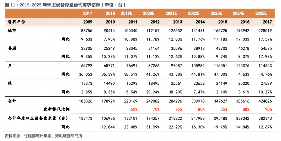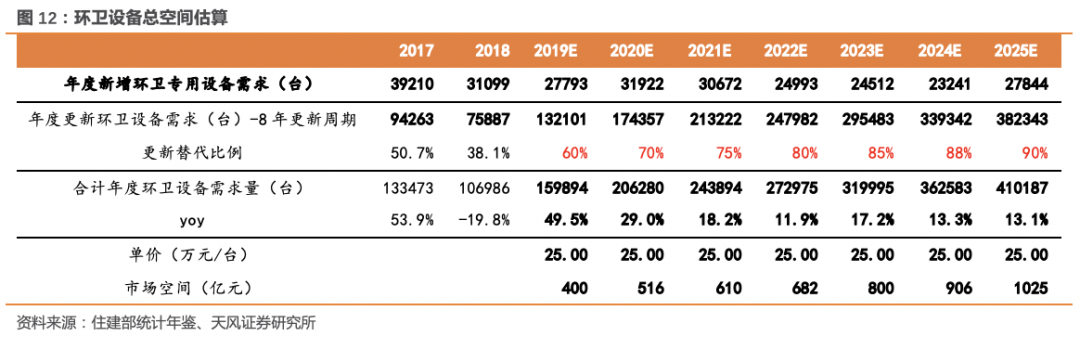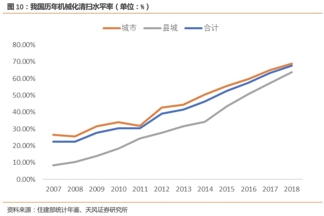 根據(jù)住建部的統(tǒng)計年鑒,2018年我國城市道路機械化率68.85%、縣城道路機械化率63.70%,城市和縣城合計的道路清掃保潔機械化率約67.68%,達到基本環(huán)衛(wèi)裝備階段。因經(jīng)濟發(fā)展水平與地域差異,不同區(qū)域間的機械化清掃水平存在差異,除省會城市和經(jīng)濟較發(fā)達地級市外,其他城市和縣城距離實現(xiàn)全面環(huán)衛(wèi)裝備階段還有差距。3.2. 機械化率存在提升空間,年度新增設(shè)備需求2-3萬臺/年根據(jù)住建部相關(guān)文件的要求,到 2020 年底前,地級及以上城市建成區(qū)道路機械化清掃率達到70%以上,縣城達到 60%以上,京津冀及周邊地區(qū)、長三角地區(qū)、汾渭平原等重點區(qū)域要顯著提高。根據(jù) 2018 年《中國城鄉(xiāng)建設(shè)統(tǒng)計年鑒》計算,2018 年我國城市道路清掃面積 86.93億平方米,機械化清掃面積 59.86億平方米,機械化清掃率為 68.85%;縣城道路清掃保潔面積 25.56億平方米,機械化清掃面積16.80億平方米,機械化清掃率僅為 63.70%。我們基于機械化率提升和單位面積環(huán)衛(wèi)車輛的假設(shè),對新增環(huán)衛(wèi)車輛市場需求進行估算,假設(shè)2019-2025年:- 城市道路清掃保潔面積年均復合增速3%左右,城市機械化率可逐步提升至80%,單位面積環(huán)衛(wèi)車輛維持0.42萬臺/億平米;