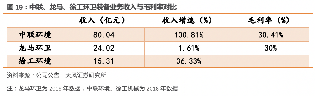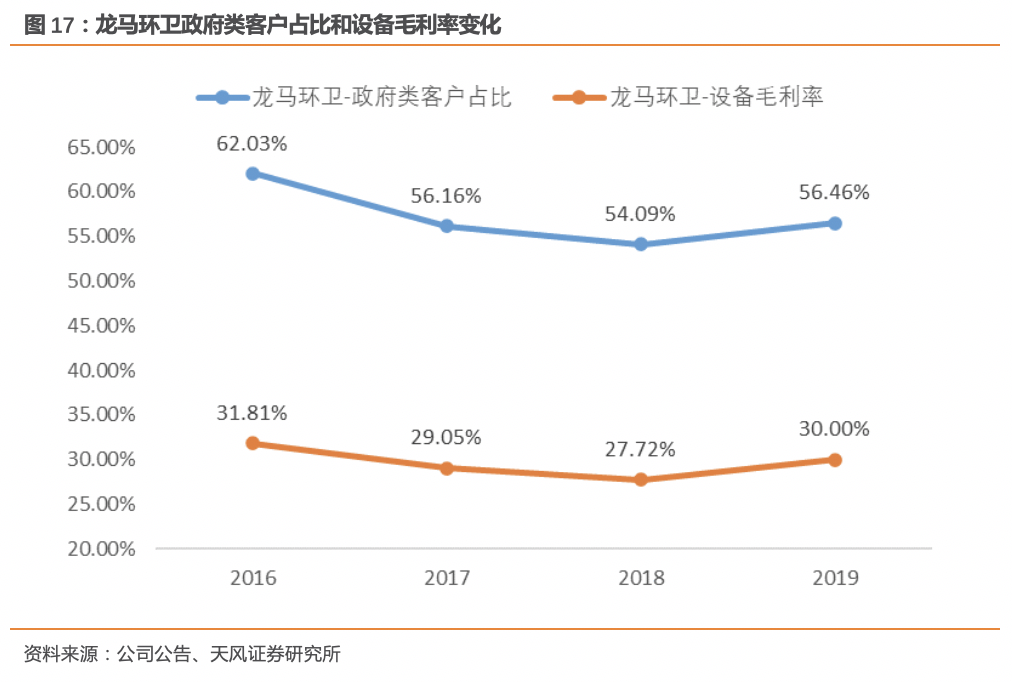 5. 環(huán)衛(wèi)裝備業(yè)的發(fā)展趨勢和競爭格局如何?客戶和產(chǎn)品結(jié)構(gòu)升級,競爭格局穩(wěn)定5.1. 客戶結(jié)構(gòu)變化:環(huán)衛(wèi)市場化推進,市場化客戶占比提升隨著環(huán)衛(wèi)市場化改革的推進,環(huán)衛(wèi)設(shè)備采購客戶類型發(fā)生顯著變化,從政府部門向市場化經(jīng)營主體轉(zhuǎn)變,需求從中高端產(chǎn)品走向高性價比的經(jīng)濟型產(chǎn)品。以龍馬環(huán)衛(wèi)為例,公司2016-2018年政府類客戶收入占比分別為62.03%、56.16%、54.09%,占比逐年下降,相應毛利率有所下降。5.2. 產(chǎn)品結(jié)構(gòu)變化:新能源、智能化產(chǎn)品需求提升國務院發(fā)布的《打贏藍天保衛(wèi)戰(zhàn)三年行動計劃》提出,加快推進城市建成區(qū)新增和更新的環(huán)衛(wèi)等六類車輛使用新能源或清潔能源汽車,重點區(qū)域使用比例達到80%。目前各地方政府已陸續(xù)發(fā)布相關(guān)政策,新能源環(huán)衛(wèi)車輛采購量增長明顯,2019年新能源產(chǎn)品需求量同比增長148.75%。2019年新能源產(chǎn)品在環(huán)衛(wèi)產(chǎn)品市場比重約3.42%,同比上升約2個百分點,未來幾年環(huán)衛(wèi)裝備新能源化進程將進一步加快。此外,智能化產(chǎn)品逐步開始由概念到落地運營,2019年盈峰環(huán)境組建的“5G+環(huán)衛(wèi)機器人編隊”正式投入深圳市福田區(qū)福田街道清掃保潔工作,成為國內(nèi)首個落地運營的5G智能清掃環(huán)衛(wèi)PPP項目,智能設(shè)備安裝5G數(shù)據(jù)終端,基于物聯(lián)網(wǎng)進行調(diào)動和管理,并通過人工智能技術(shù)進一步提升市政環(huán)衛(wèi)作業(yè)的效率和效果。環(huán)衛(wèi)裝備行業(yè)的競爭格局相對穩(wěn)定,全國環(huán)衛(wèi)車輛生產(chǎn)企業(yè)約322家,市場參與者較多,但普遍規(guī)模較小。根據(jù)行業(yè)強制險的統(tǒng)計數(shù)據(jù),截止2019年底,年銷量超過7000臺/套只有三家,TOP3市場份額從2016年的37%上升至2019年的40%。目前我國環(huán)衛(wèi)裝備市場的主要參與者包括中聯(lián)重科、龍馬環(huán)衛(wèi)、以湖北程力為代表的湖北改裝企業(yè),以北汽福田為主的底盤廠家。另外,由于國外進口的環(huán)衛(wèi)清潔及垃圾收轉(zhuǎn)裝備的價格偏高,因此進口產(chǎn)品數(shù)量很少,國外廠商與國內(nèi)廠商的市場定位不同,難以形成直接競爭。環(huán)衛(wèi)裝備行業(yè)屬于改裝行業(yè),具有較高的技術(shù)、品牌、營銷網(wǎng)絡(luò)、售后服務、資質(zhì)及資金壁壘,對客戶需求、采購習慣具有較高的要求,行業(yè)領(lǐng)先者主要通過提高產(chǎn)品性能和技術(shù)水平、豐富產(chǎn)品種類、完善客戶服務體系等手段進行競爭。環(huán)衛(wèi)行業(yè)目前處于市場化快速發(fā)展階段,2018-2019年新增訂單已連續(xù)兩年突破2000億元,垃圾強制分類是推動本輪市場化改革的重要原因。隨著城市管理由分散走向集中,我們認為傳統(tǒng)環(huán)衛(wèi)服務市場將不斷擴容,向城市綜合物業(yè)方向發(fā)展。目前行業(yè)集中度仍然較低,但環(huán)衛(wèi)服務二次市場化帶來的新機遇值得重視,一體化環(huán)衛(wèi)PPP項目增多,將提高行業(yè)門檻,預計行業(yè)集中度將明顯提升。我們認為環(huán)衛(wèi)服務龍頭企業(yè)將同時受益于行業(yè)空間擴容、和市場集中度提升,建議關(guān)注【玉禾田】【僑銀環(huán)?!俊君堮R環(huán)衛(wèi)】【啟迪桑德】【北控城市資源】【盈峰環(huán)境】【中國天楹】。環(huán)衛(wèi)裝備方面,我國城鎮(zhèn)與縣城合計機械化率67.68%,達到基本環(huán)衛(wèi)裝備階段,不同區(qū)域間機械化率差別較大,預計未來存量更新需求將逐步崛起,產(chǎn)品向新能源、智能化方向發(fā)展,客戶結(jié)構(gòu)中市場化客戶占比提升,行業(yè)格局將維持穩(wěn)定,建議關(guān)注【盈峰環(huán)境】【龍馬環(huán)衛(wèi)】。行業(yè)競爭加劇、環(huán)衛(wèi)市場化推進慢于預期、存量裝備更新替代慢于預期