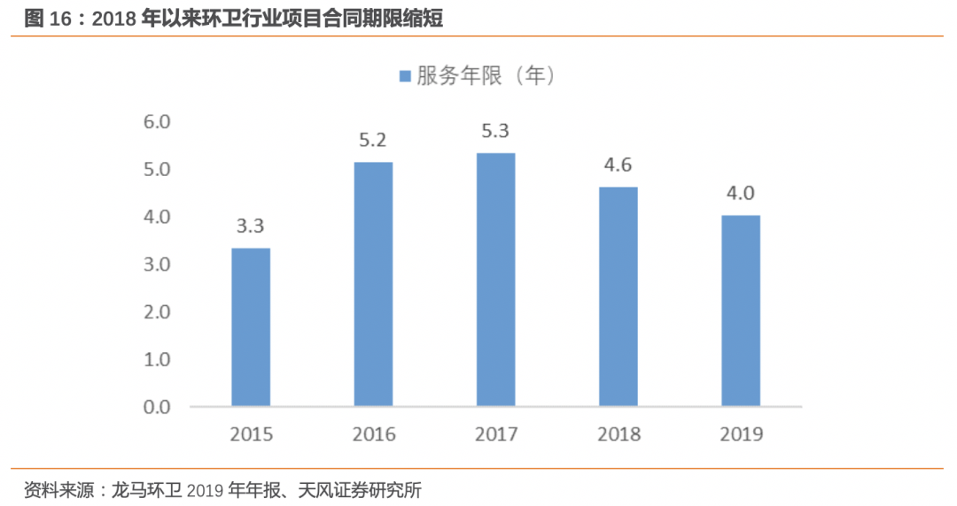 環(huán)衛(wèi)行業(yè)巨大的市場空間和良好的商業(yè)模式,吸引各方社會資本加入,2018年行業(yè)參與者約4000余家,前五大企業(yè)市場份額約11.4%。目前行業(yè)內(nèi)參與者可大致分為以下幾類:環(huán)衛(wèi)專業(yè)服務商如玉禾田、僑銀環(huán)保、新安潔、升禾環(huán)保等;國企改制單位,如北京環(huán)衛(wèi)集團、名城科技等;固廢終端處置商,如啟迪桑德、中國天楹、錦江環(huán)境等;環(huán)衛(wèi)設(shè)備制造商,如龍馬環(huán)衛(wèi)、中聯(lián)環(huán)境;環(huán)衛(wèi)信息化解決商,如伏泰科技;以及其他新進入者,如北控城市資源、聯(lián)運環(huán)境等。環(huán)衛(wèi)服務按照政府招標模式一般分為政府購買服務或PPP兩類,政府購買服務一般運營期限較短,約3-5年;PPP模式的環(huán)衛(wèi)項目一般體量較大,運營期限約15-30年。2018年P(guān)PP模式降溫,平均合同期有所縮短:行業(yè)發(fā)展初期訂單以政府購買服務方式為主;2016-2017年P(guān)PP模式訂單快速增長,訂單平均運營期限拉長;2018年以來,受PPP政策監(jiān)管影響,PPP模式訂單增速放緩,訂單平均運營期限有所縮短。自2019年下半年以來,PPP模式類項目預期有所升溫,主要由于垃圾分類帶動下的中轉(zhuǎn)設(shè)備、中轉(zhuǎn)設(shè)施、末端處置設(shè)施建設(shè)資金需求,帶動環(huán)衛(wèi)訂單從單一的環(huán)衛(wèi)清掃保潔,向環(huán)衛(wèi)一體化方向發(fā)展,PPP模式類項目往往伴隨著前期資金的投入,將提高行業(yè)資金門檻。4.4. 二次市場化帶來新機遇,提升環(huán)衛(wèi)行業(yè)集中度雖然環(huán)衛(wèi)行業(yè)市場化訂單整體增速有所放緩,但我們注意到隨著首次市場化的環(huán)衛(wèi)項目合同到期,大量環(huán)衛(wèi)項目迎來二次市場化。在城市管理由分散走向綜合,以及大力發(fā)展垃圾分類的背景下,二次市場化的環(huán)衛(wèi)項目普遍具有規(guī)?;⒁惑w化、智能化的趨勢,行業(yè)進入門檻提高,行業(yè)集中度將不斷提升。以深圳市環(huán)衛(wèi)項目為例,深圳市現(xiàn)有的環(huán)衛(wèi)管理業(yè)務包括“市政道路清掃保潔、生活垃圾收集、運輸及處理,公廁管理等”,實行市、區(qū)、接到三級管理體制。1984年,深圳市在全國率先推動道路清掃保潔市場化;1993年,深圳市環(huán)衛(wèi)處將清掃保潔業(yè)務管理權(quán)限移交給區(qū)一級;1999年,深圳市環(huán)衛(wèi)處將垃圾運輸作業(yè)管理權(quán)限下放到區(qū)一級;2019年深圳市引入環(huán)衛(wèi)PPP模式:- 2019年9月27日,深圳市第一個環(huán)衛(wèi)PPP項目——深圳市福田區(qū)政府環(huán)衛(wèi)PPP項目公開招標,盈峰環(huán)境全資子公司中聯(lián)環(huán)境中標,總金額11.53億元,服務周期10年。