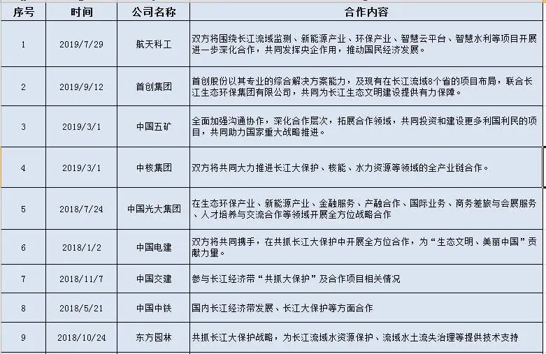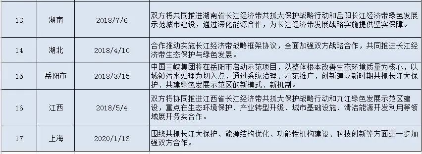 據(jù)不完全統(tǒng)計,截止2020年4月,政府方面:有 7個省(市)及21個市縣;企業(yè)方面:有多家基建、環(huán)保企業(yè)及金融機構簽訂長江大保護框架協(xié)議。