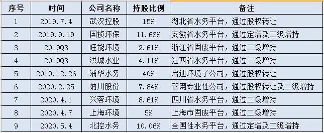 2019年以來,三峽集團通過直接或者間接的方式參股了9家環(huán)保行業(yè)上市公司,其中 6家水務企業(yè),2家固廢業(yè)務,1家管網企業(yè),未來還將圍繞長江治理的需求參股更多上市公司。