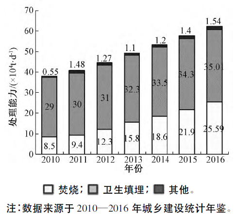 盡管能力逐年提升,我國生活垃圾處理目前仍存在較大缺口,以2016年計,每天仍有1.89萬t城市生活垃圾未得到無害化處理,提升處理能力仍是目前生活垃圾管理工作的重中之重。
