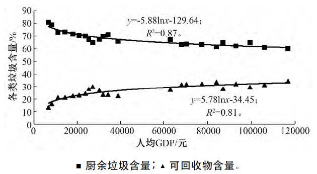 圖3 廚余垃圾、可回收物含量與人均GDP的關(guān)系