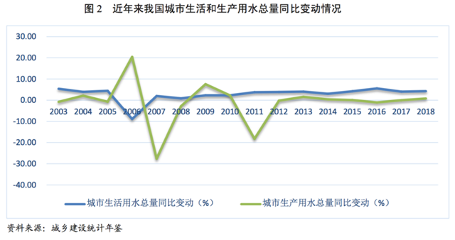 從具體子行業(yè)來看,除2006年居民生活用水有所波動外[3],其他年份居民生活用水總量增速保持穩(wěn)定,生產(chǎn)用水在2012年之前波動較大,之后年度增速變動與生活用水趨同。從具體波動來看,生產(chǎn)用水波動與我國水務政策密切相關,2006年,我國在《十一五規(guī)劃綱要》中首次提出“節(jié)能減排”使得我國生產(chǎn)用水量同比下降,加之經(jīng)濟危機因素影響,生產(chǎn)用水量在2007年和2008年同比增速為負,之后隨著經(jīng)濟發(fā)展用水量同比增速又有所回升。2011年,十二五規(guī)劃出臺《“十二五”節(jié)能減排綜合性工作方案》,使得用水總量同比增速呈現(xiàn)大幅下降,但政策之后保持相對穩(wěn)定。根據(jù)《國家節(jié)水行動方案》要求,到2022年,萬元國內(nèi)生產(chǎn)總值和工業(yè)增加值用水量較2015年分別降低30%和28%,預期我國生產(chǎn)用水效率將有所增長,進而對沖因經(jīng)濟總量的持續(xù)增長對生產(chǎn)用水總量需求的增加,工業(yè)生產(chǎn)整體用水總量預期保持穩(wěn)定。
