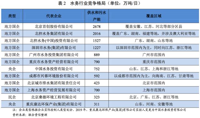水務企業(yè)類型和競爭格局方面,目前,我國行業(yè)內(nèi)分布的水務企業(yè)大致可分為三種,國有水務企業(yè)(央企和地方國企)、外商投資水務企業(yè)和民營水務企業(yè)。其中,國有地方水務企業(yè)普遍,多為所在地方原事業(yè)單位改制形成,其業(yè)務結構相對單一,以服務所在區(qū)域供水和污水處理為主業(yè),區(qū)域壟斷性突出,是水務行業(yè)的主力軍。部分實力較強的區(qū)域(北京、深圳、成都、重慶等地)地方國有水務企業(yè)和央屬水務企業(yè)基于雄厚的股東背景、資金實力和技術水平,通過并購、合資、參控股、BOT和PPP等方式在全國范圍內(nèi)或國外異地擴張,獲取供水和污水處理業(yè)務特許經(jīng)營權,并通過水務衍生行業(yè)拓展成為投資型綜合水務企業(yè),對原區(qū)域內(nèi)地方水務企業(yè)產(chǎn)生一定競爭。外資水務企業(yè)往往擁有先進的水務技術和較高的管理水平,尤其在污水處理行業(yè)處于技術領先地位,但進入中國水務市場數(shù)量較少。民營水務企業(yè)所占市場份額較小,主要通過PPP模式在污水處理和水環(huán)境治理領域參與競爭,面臨較大投資和回款壓力。