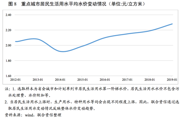近年來,我國重點城市居民生活用水價格整體呈現(xiàn)小幅上漲趨勢,2019年,部分城市居民生活用水價格進一步調(diào)升;水資源匱乏城市水價格較高;伴隨著水價改革的推進,及節(jié)水政策指導下水價調(diào)控作用的發(fā)揮,預期城市供水價格未來仍有進一步上調(diào)空間。