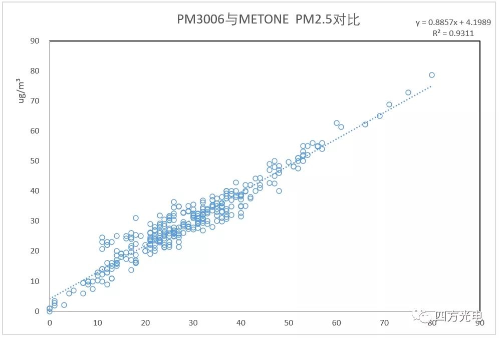 我國室外揚塵網(wǎng)格化監(jiān)測經(jīng)歷了早期的β射線吸收法,到采用民用凈化器大量應用的激光粉塵傳感器的過程。在使用過程中發(fā)現(xiàn),民用的激光粉塵傳感器不僅不能滿足-30——70℃室外環(huán)境溫度的全天候使用要求,同時還必須面對監(jiān)測場所,特別是建設(shè)工地經(jīng)常噴灑降霾的水霧影響,或者下雨潮濕的氣候環(huán)境等。這種環(huán)境下,水霧經(jīng)常被判斷為嚴重霧霾造成爆表。同時網(wǎng)格化室外粉塵監(jiān)控希望得到局部的可以與國家大氣環(huán)境監(jiān)測網(wǎng)數(shù)據(jù)具備的PM2.5/PM10/TSP的多項參數(shù)對比, 民用激光傳感器由于激光功率小,采樣流量小, PM10分辨率很低,無法提供準確的PM10, 通常采用根據(jù)PM2.5的數(shù)字進行比例計算,造成PM10監(jiān)測數(shù)據(jù)失真。四方光電研制的PM3003X、 PM3006激光揚塵傳感器通過采用寬溫型大功率線型激光光源、API粉塵自動識別技術(shù)、先進的流道設(shè)計實現(xiàn)抗污染、大流量車規(guī)級采樣機構(gòu)、高濕度環(huán)境的水霧去除裝置等,低成本地實現(xiàn)了對室外揚塵粉塵與β射線吸收法達到0.9相關(guān)系數(shù)的高精度測量。