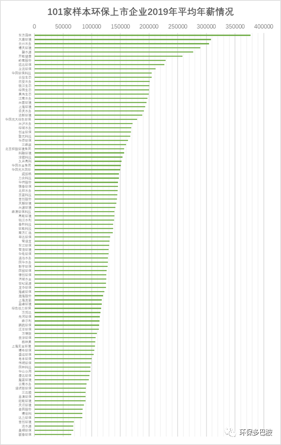 個(gè)人認(rèn)為這是兩個(gè)正面因素和一個(gè)負(fù)面因素的疊加。兩個(gè)正面因素一為,行業(yè)中出現(xiàn)了一些對(duì)高端人才更具吸引力的非環(huán)保上市企業(yè)組織,如長(zhǎng)江環(huán)保集團(tuán)、江蘇環(huán)保產(chǎn)業(yè)集團(tuán)、布局環(huán)保的大國(guó)企央企等。二為,積累了足夠資源跳出環(huán)保上市公司轉(zhuǎn)而創(chuàng)業(yè)的人群。這部分人數(shù)難以客觀統(tǒng)計(jì),但相信諸位的圈子里一定就有這兩年跳出來(lái)創(chuàng)業(yè)的朋友,總數(shù)應(yīng)該也不少。負(fù)面因素為,數(shù)量不少環(huán)保上市企業(yè)內(nèi)部實(shí)實(shí)在在的變化真的讓一些人或主動(dòng)或被動(dòng)選擇離開(kāi),甚至轉(zhuǎn)行,這也是無(wú)法回避的事實(shí)。終于要討論到收入了,直奔主題:環(huán)保上市公司的薪酬情況如何?本文整理了101家樣本環(huán)保上市公司(在前文人員工統(tǒng)計(jì)分析102家樣本基礎(chǔ)上再次剔除異常值“科林環(huán)?!保┑男劫Y支付現(xiàn)金流數(shù)據(jù),即年報(bào)現(xiàn)金流量表“支付給職工以及為職工支付的現(xiàn)金”科目。(注:支付給職工以及為職工支付的現(xiàn)金主要包括——本期實(shí)際支付給職工的工資、獎(jiǎng)金、各種津貼和補(bǔ)貼等;以及為職工支付的養(yǎng)老、失業(yè)等社會(huì)保險(xiǎn)基金、補(bǔ)充養(yǎng)老保險(xiǎn)、企業(yè)為職工支付的商業(yè)保險(xiǎn)金、住房公積金、支付給職工的住房困難補(bǔ)助,以及企業(yè)支付給職工或?yàn)槁毠ぶЦ兜母@M(fèi)用等)將結(jié)果與員工人數(shù)相除,得到企業(yè)薪酬圖表。
