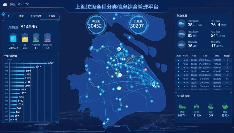 該平臺(tái)自2018年底建成投用,用真實(shí)數(shù)據(jù)實(shí)時(shí)繪制申城垃圾物流走向圖,實(shí)現(xiàn)數(shù)字化、可視化監(jiān)控,賦予生活垃圾“數(shù)字生命”。具體來說,垃圾產(chǎn)生的時(shí)間,從哪個(gè)轄區(qū)來的,哪輛車清運(yùn)的,裝進(jìn)了哪個(gè)集裝箱,運(yùn)到哪里處置,全部一清二楚。目前,該平臺(tái)已接入全市16個(gè)區(qū)的生活垃圾數(shù)據(jù),大大提升了分類實(shí)效。在智能化監(jiān)管之前,干濕垃圾比例是在9比1,現(xiàn)在已經(jīng)“逆襲”到6比4左右,這恰恰說明更多濕垃圾從干垃圾里分出來了,分類精度大幅躍升。