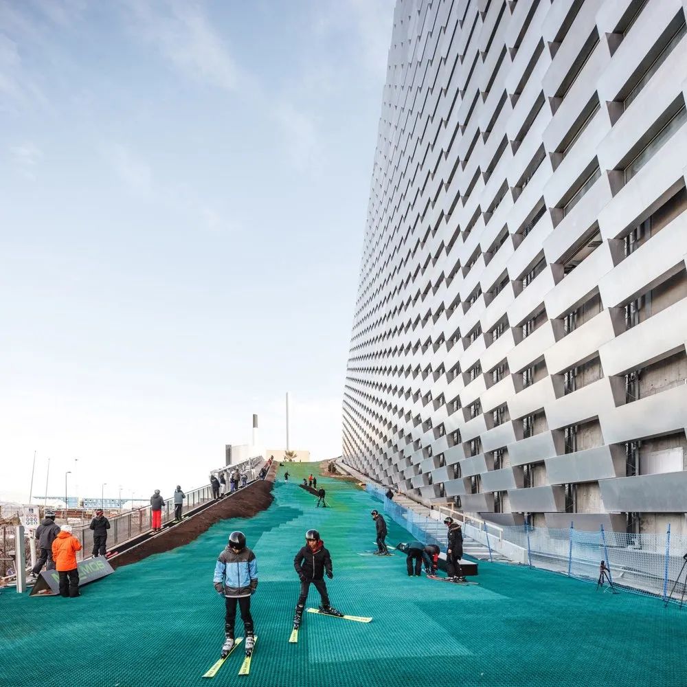一座垃圾發(fā)電廠能改造出多少花頭,看完 CopenHill,真的被建筑師的腦洞驚艷到,400m 的屋頂滑雪場、公園步道、85m的人工攀巖墻、咖啡店、酒吧,每一處設(shè)計(jì)都在為當(dāng)?shù)厝嗣駧碜罘潘傻挠瓮骟w驗(yàn)。從最受矚目的滑雪場說起,雖然丹麥氣候寒冷,但這里卻缺乏山脈,以前人們?yōu)榱嘶┲荒茯?qū)車幾百公里到瑞典滑雪。CopenHill 的出現(xiàn),讓哥本哈根擁有了第一個(gè)滑雪場不同于白雪皚皚的滑雪道,這個(gè)滑雪場放眼望去皆是綠色。這是一種特殊的合成材料,由一個(gè)個(gè)小的幾何單元構(gòu)成。
