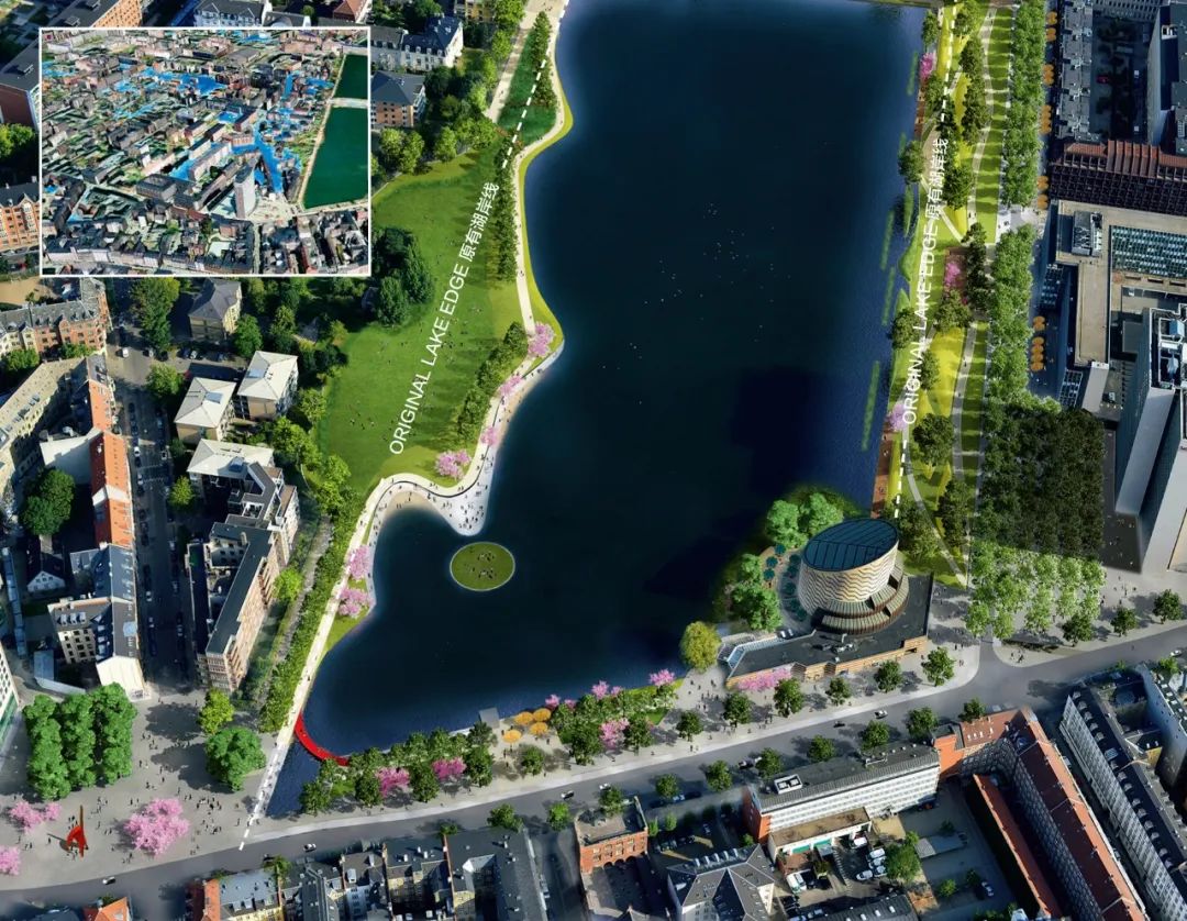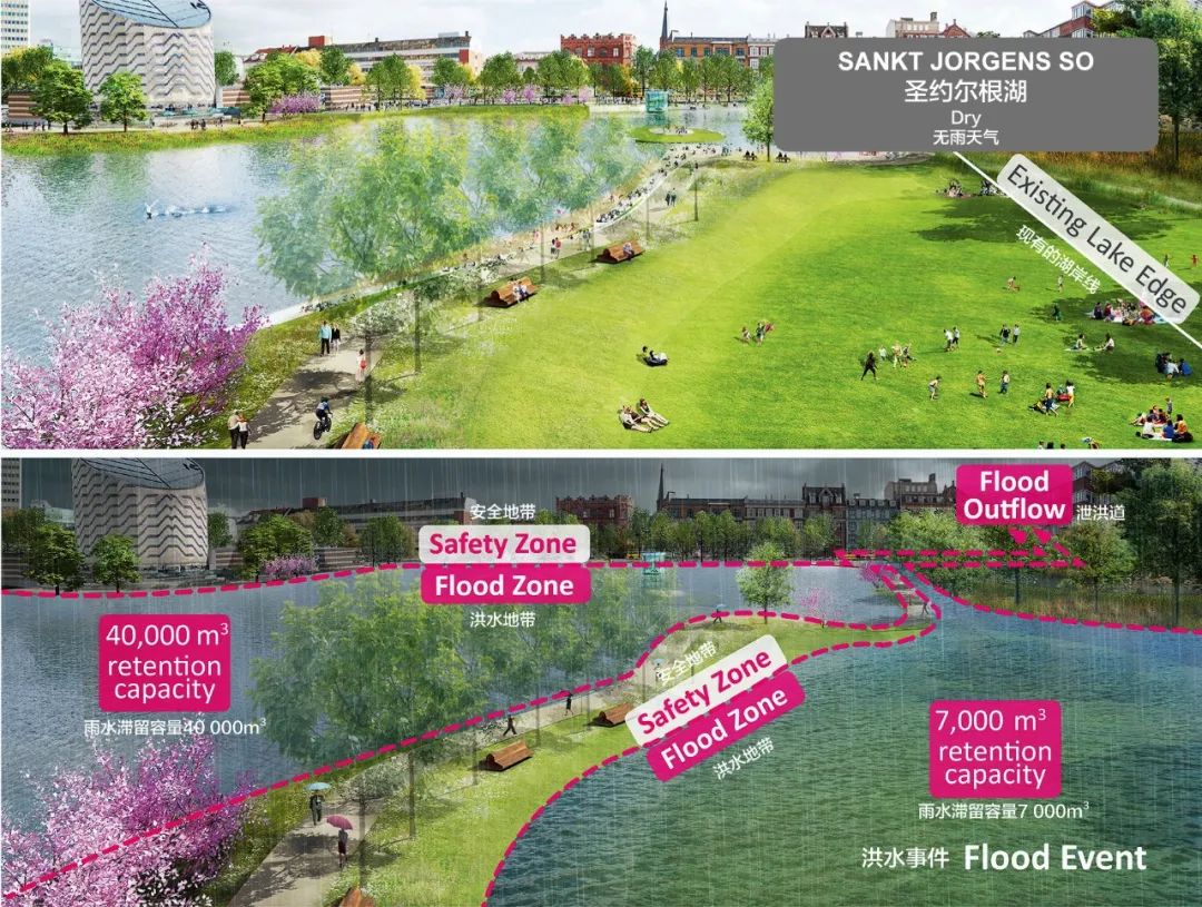 我們的具體策略之一是雨水滯留公園,這是我們的海綿城市“暴雨防控方案”中的一個(gè)關(guān)鍵要素。眾所周知,景色怡人的“藍(lán)綠公園”能夠?yàn)榫用窠】祹?lái)巨大裨益,而經(jīng)過(guò)設(shè)計(jì),這些公園也可以成為吸納特大洪水的“海綿”。該規(guī)劃充分利用哥本哈根市區(qū)三大內(nèi)湖之一的圣約爾根湖,通過(guò)將湖水水位由5.8m降低到2.8m,使其成為一座風(fēng)景秀美的湖濱公園。在提升城市休閑娛樂(lè)價(jià)值的同時(shí),海綿城市設(shè)計(jì)也為城市創(chuàng)造出一大片雨水集蓄區(qū)。而傳統(tǒng)的工程設(shè)計(jì)方式則只能通過(guò)建造巨型的、造價(jià)高昂的泄洪道或管網(wǎng)來(lái)傳輸雨水——而鑒于大型暴雨事件十分罕見(jiàn),這些設(shè)施在絕大多數(shù)情況下都將處于閑置狀態(tài)。與埋設(shè)地下雨洪排水管的工程造價(jià)相比,建造于地上的圣約爾根湖方案將節(jié)省大約10億元人民幣。通過(guò)這一看似簡(jiǎn)單的景觀設(shè)計(jì)策略,安博實(shí)現(xiàn)了以遠(yuǎn)低于傳統(tǒng)水泥蓄水池的成本來(lái)建造巨型蓄水設(shè)施的目標(biāo)。更為重要的是,人們可以走進(jìn)我們新建的藍(lán)綠公園,享受閑暇與歡愉。