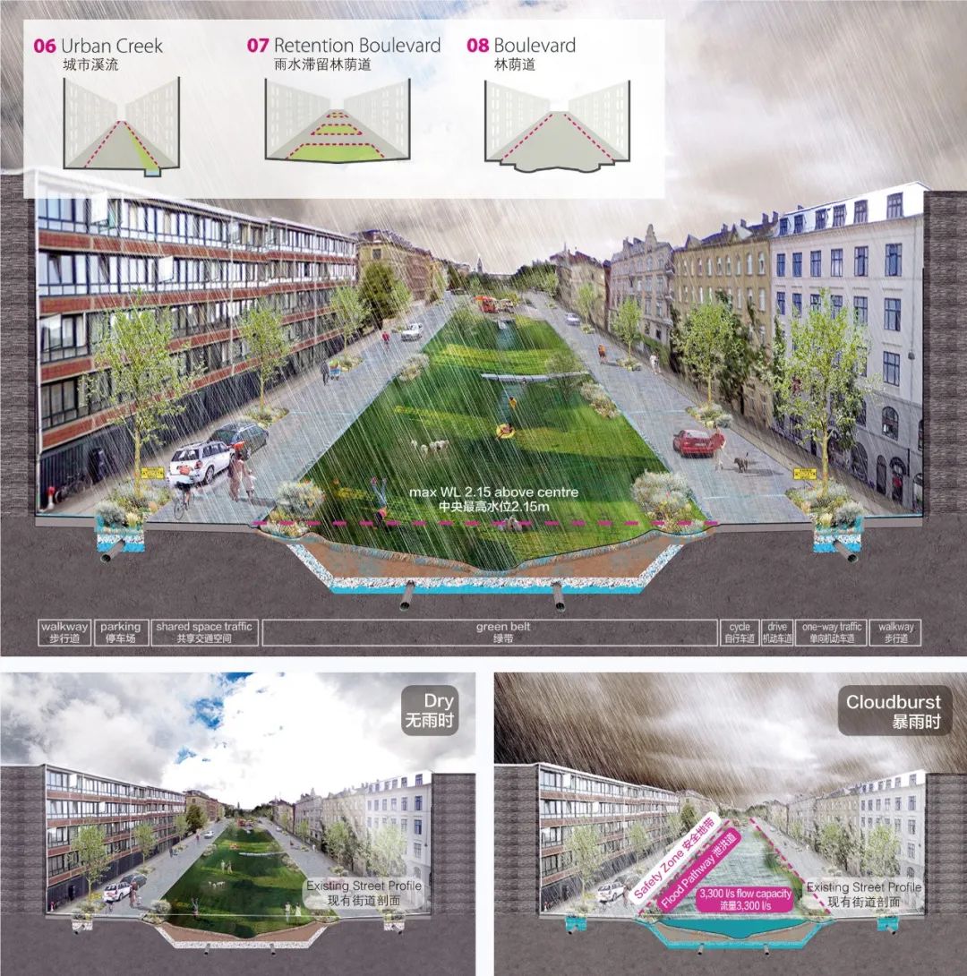 另一個(gè)用來(lái)緩解極端暴雨影響的具體策略是雨水滯留街道。這些街道通常是位于低洼、脆弱區(qū)域上游的次級(jí)道路,通過(guò)街道內(nèi)部的設(shè)計(jì)來(lái)創(chuàng)造巨大的蓄水空間。在不對(duì)交通產(chǎn)生重大妨礙的情況下,這些次級(jí)道路通??杀桓脑斐捎晁疁艚值馈Mㄟ^(guò)增加洼地、透水鋪裝等方式實(shí)現(xiàn)對(duì)雨水的滯留,并可以凈化雨水,從而實(shí)現(xiàn)對(duì)地下含水層的補(bǔ)給。