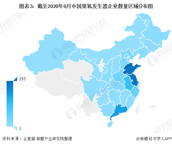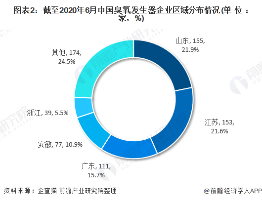 截至2020年6月,通過(guò)企查貓查詢得出的709家企業(yè)中,大部分企業(yè)分布在山東、江蘇和廣東地區(qū),三個(gè)省份企業(yè)數(shù)量占全國(guó)的59.1%。前五省份企業(yè)數(shù)量占全國(guó)的75.5%。整體來(lái)看,臭氧發(fā)生器行業(yè)區(qū)域市場(chǎng)集中度較高。