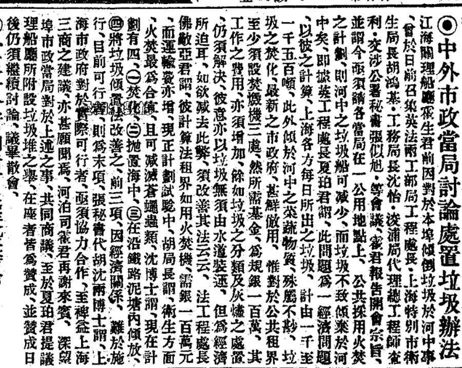 江海關(guān)理船應(yīng)霍生君前因?qū)侗静簝A倒垃圾於河中事丶曾於日前召集英法兩江部局工程處長·上海特別市衛(wèi)生局長胡鴻基·工務(wù)局長沈怡·浚浦局代理總工程師查利·交涉公署秘書張似旭·等會議丶霍君報告開會宗旨丶並謂今亟須請各當局在一公用地點上丶公共採用火焚之計劃丶則河中之垃圾船可減少丶而垃圾不致傾棄於河中矣丶即據(jù)英工程處長夏珀君謂丶此問題爲一經(jīng)濟問題丶以彼之計算丶上海各方每日所出之垃圾丶計由一千至一千五百噸丶此外傾於河中之菜蔬物質(zhì)丶殊屬不尠丶垃圾之焚化丶最新之市政府丶甚鮮倣用丶惟對於公共租界至少須設(shè)焚燬機三處丶然所需基金丶爲規(guī)銀一百萬丶其工作之費用丶亦須增加丶餘如垃圾之分類及灰燼之處置丶仍須解決丶彼意亦以垃圾無須由水道裝運丶但爲經(jīng)濟所迫耳丶如欲減去此弊丶須改善其法云云……